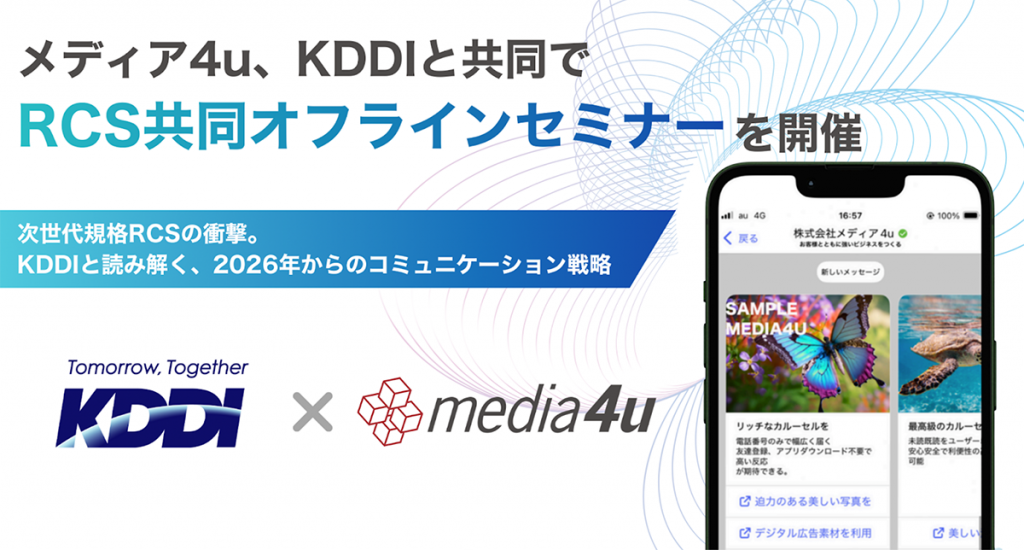 株式会社メディア4u(本社:東京都港区、代表取締役社長:岩館 徹、以下 メディア4u)は、KDDI株式会社(本社:東京都港区、代表取締役社長:松田 浩路、以下 KDDI)と共同で、2026年1月29日(木)に次世代メッセージング規格「RCS(Rich Communication Services)」をテーマとしたオフライン形式のセミナーを実施します。